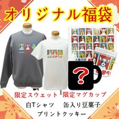 裏起毛暖スウェット・Tシャツ・マグカップ、プリントクッキー、豆菓子の5点セットです。